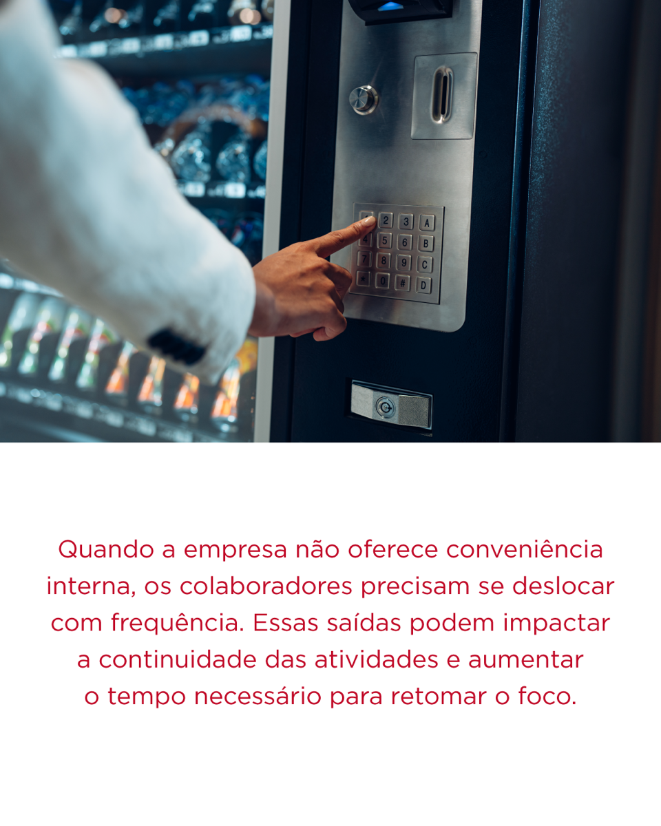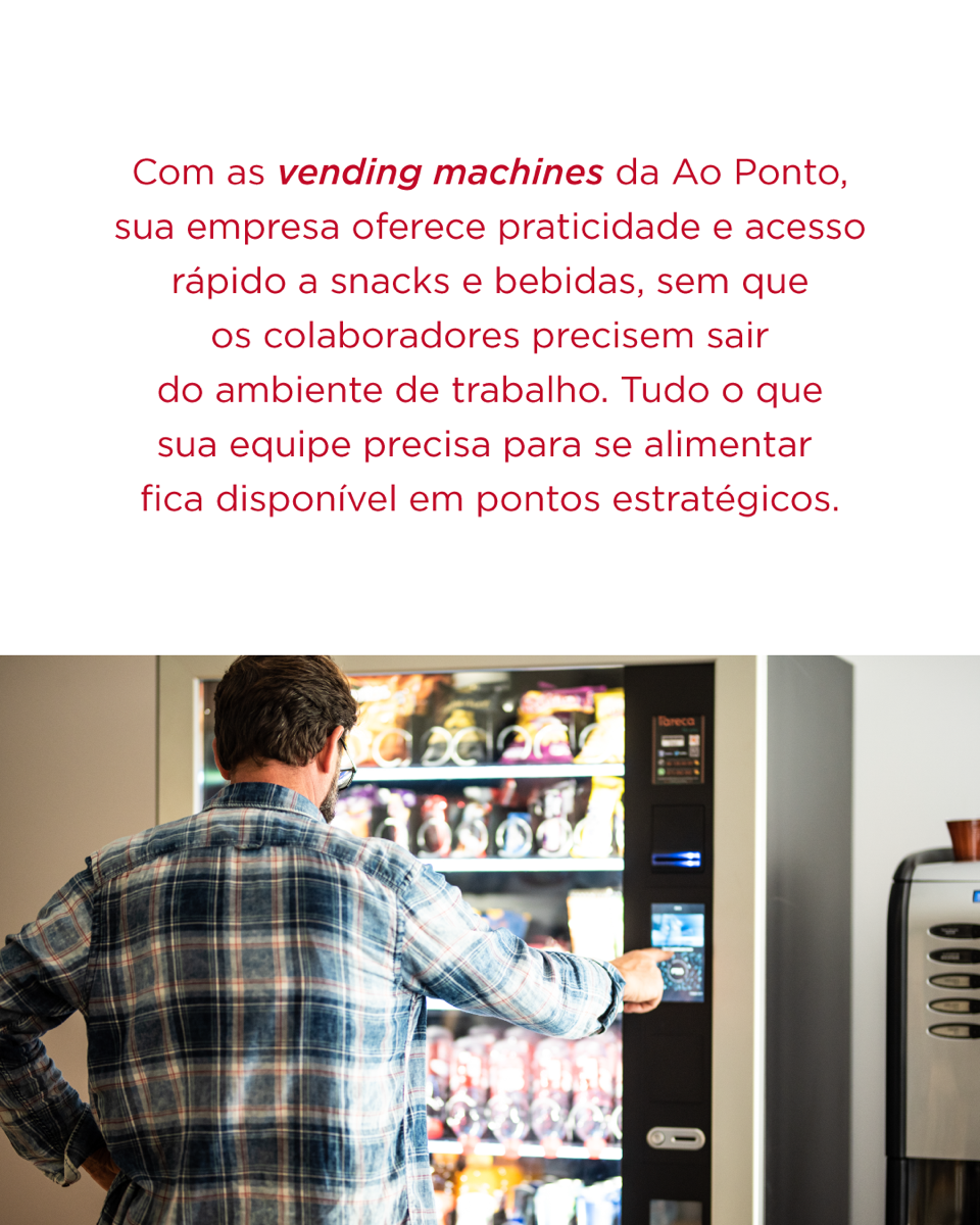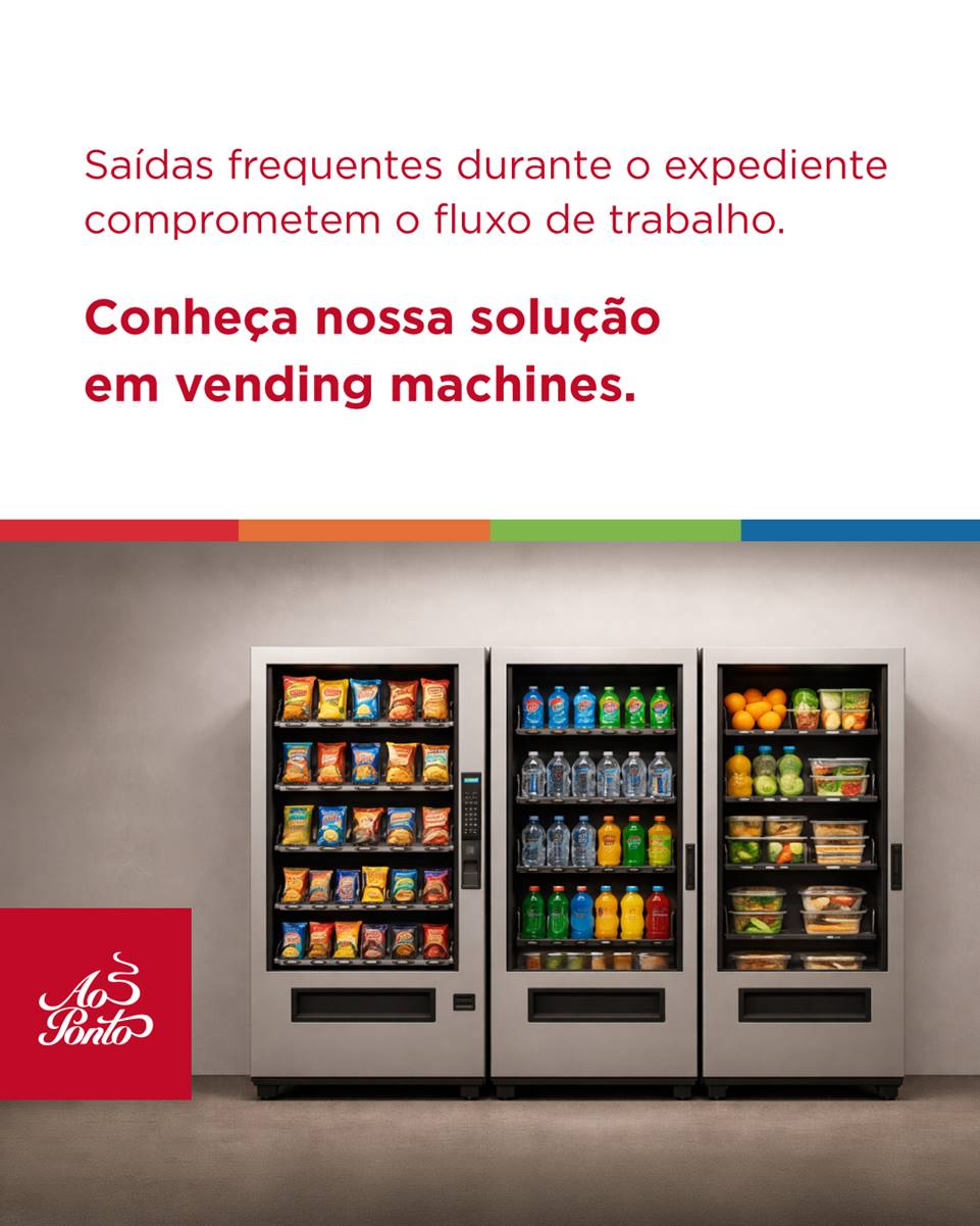 A ausência de conveniência interna leva colaboradores a saídas recorrentes, comprometendo o foco e o ritmo de trabalho. Com as vending machines da Ao Ponto, sua empresa oferece acesso rápido a snacks e bebidas sem a necessidade de deslocamento, garantindo mais praticidade, autonomia e um ambiente mais produtivo. Para saber mais e solicitar uma proposta, entre em contato pelo e-mail aoponto@aoponto.com.br.